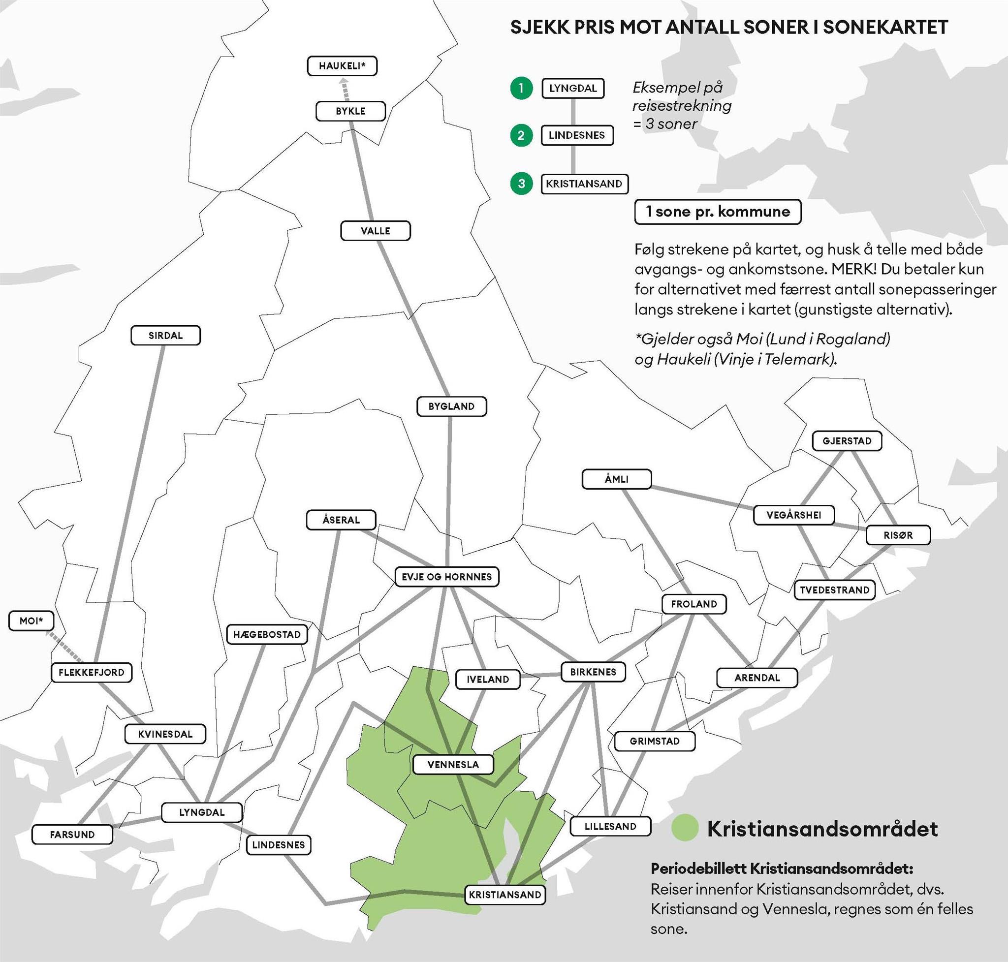 Finn antall soner du skal reise i før du finner riktig pris i pristabellene. I Agder er 1 sone = 1 kommune. Du betaler for maks 6 soner ved bruk av enkeltbillett og maks 3 soner for periodebillett voksen. Følg strekene på kartet, og husk å telle med både avgangs- og ankomstsone. MERK! Du betaler kun for alternativet med færrest antall sonepasseringer langs strekene i kartet (gunstigste alternativ).