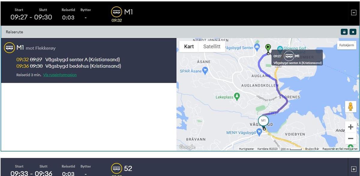 Se bussen live i kartKartet viser busslinjene i Kristiansand og Vennesla. I tillegg får du informasjon om holdeplasser i Kvadraturen og Kristiansand rutebilstasjon.